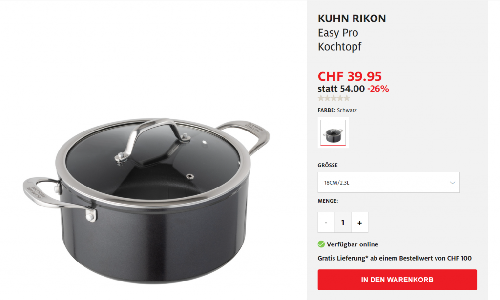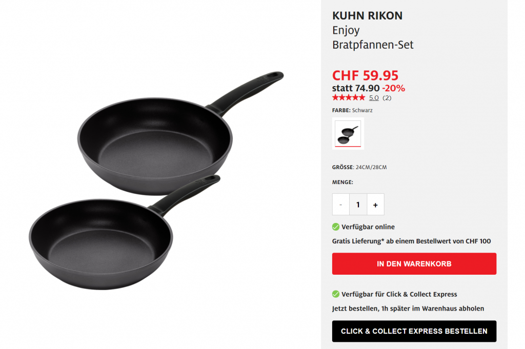 Beispiel: Kuhn Rikon Enjoy Bratpfannen-Set für CHF 59.90 Zweitbester Preis scheint CHF 74.10 bei Galaxus zu sein.