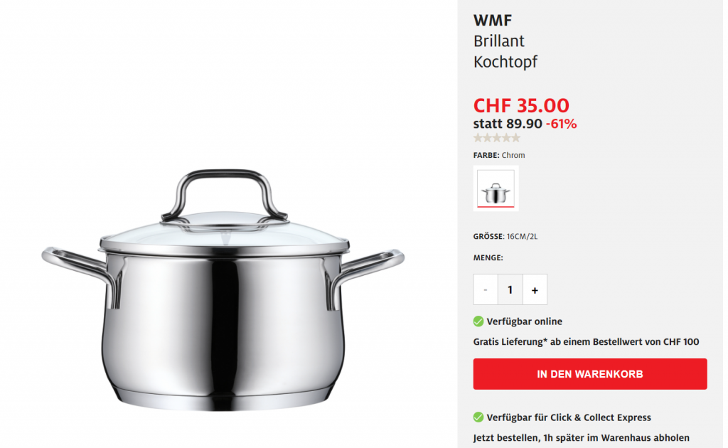 Oder den WMF Brilliant Kochtopf 2l für CHF 35.- wofür ich keinen Vergleichspreis finden konnte: