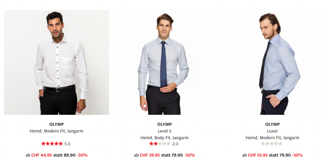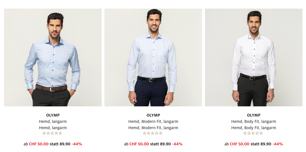 Auch Marken-Hemden von Olymp sind mit 30-50% reduziert. Knapp 50 Modelle von Olymp sind reduziert erhältlich: