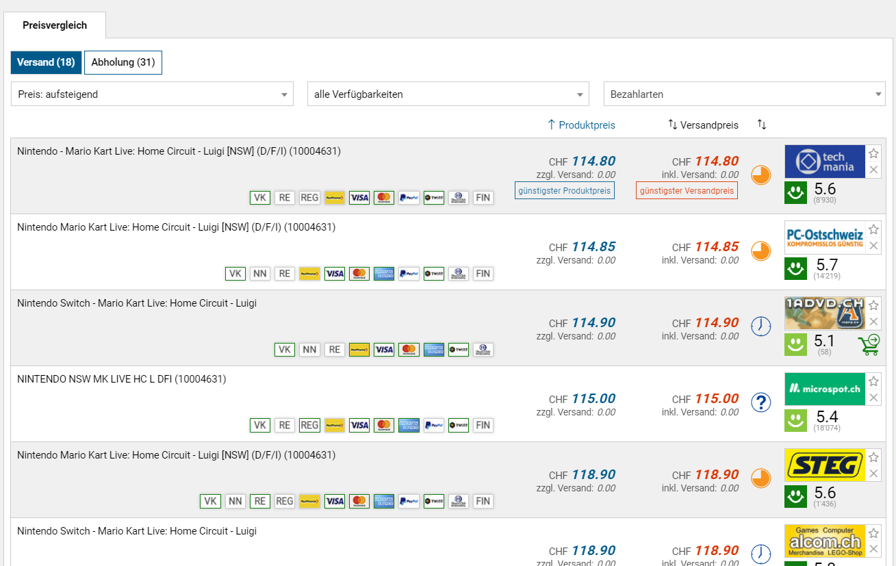 Bei Amazon kann man sich derzeit das Spiel Mario Kart Live: Home Circuit (Luigi) zum Vorbestellpreis von knapp 95 Franken sichern. Laut toppreise starten die Preise in der Schweiz bei CHF 114.80. Beachtet, dass der Release am 16.10. stattfindet.