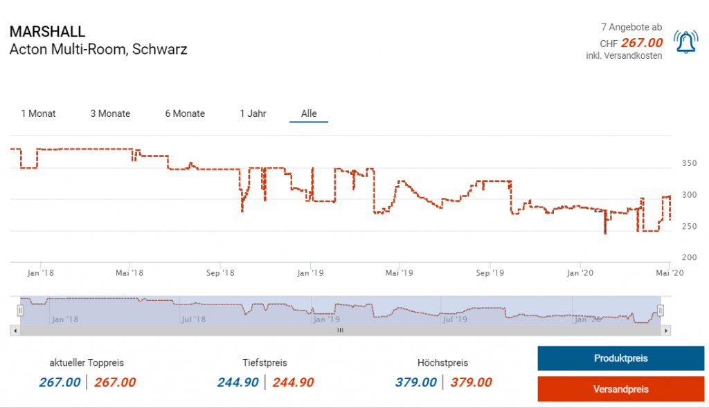Jedenfalls gibts die erste Generation bei DayDeal für 199 Franken im Angebot, zweitbester Preis laut toppreise liegt bei CHF 267.-, bei amazon.de gibts den Lautsprecher aber schon ab 223 Franken.