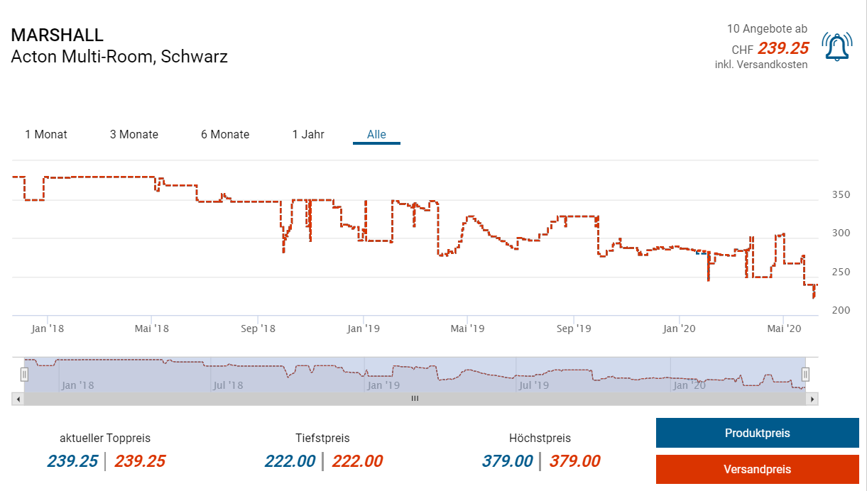 Bei brack gibts derzeit den Multiroom-Lautsprecher Acton von Marshall in Aktion für etwa 239 Franken. Der tiefste Preis lag zuletzt bei 199 Franken im Daydeal vor einigen Wochen.
