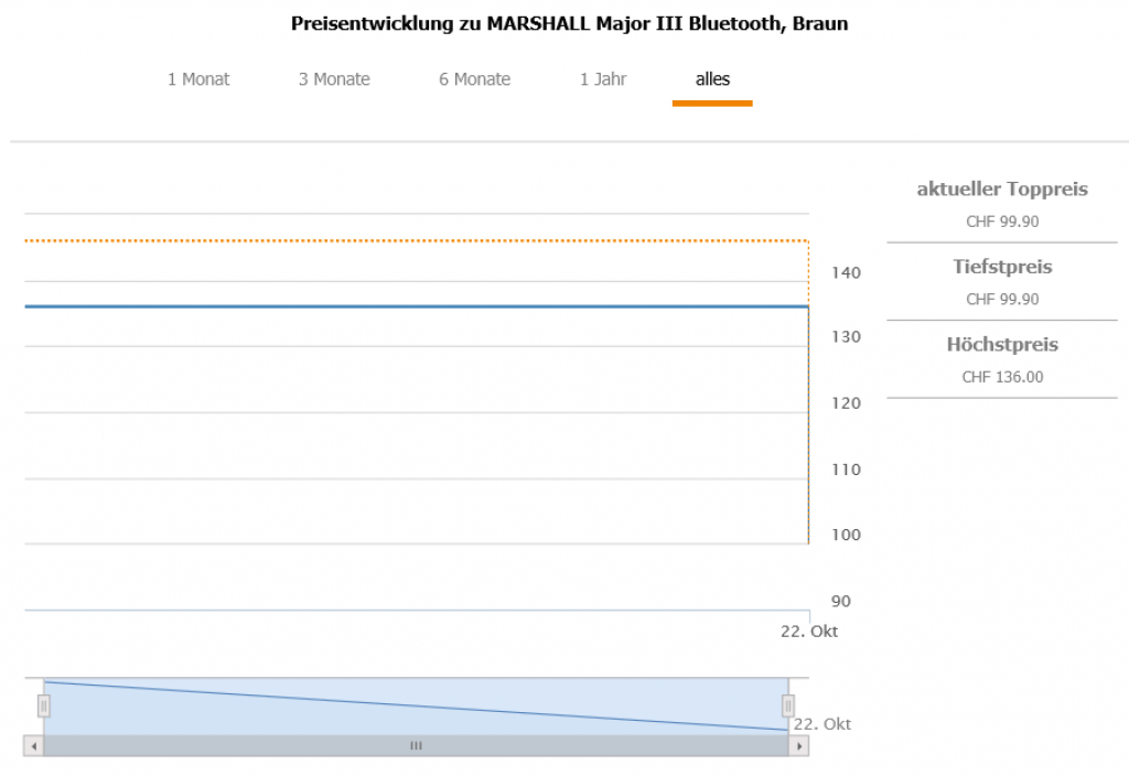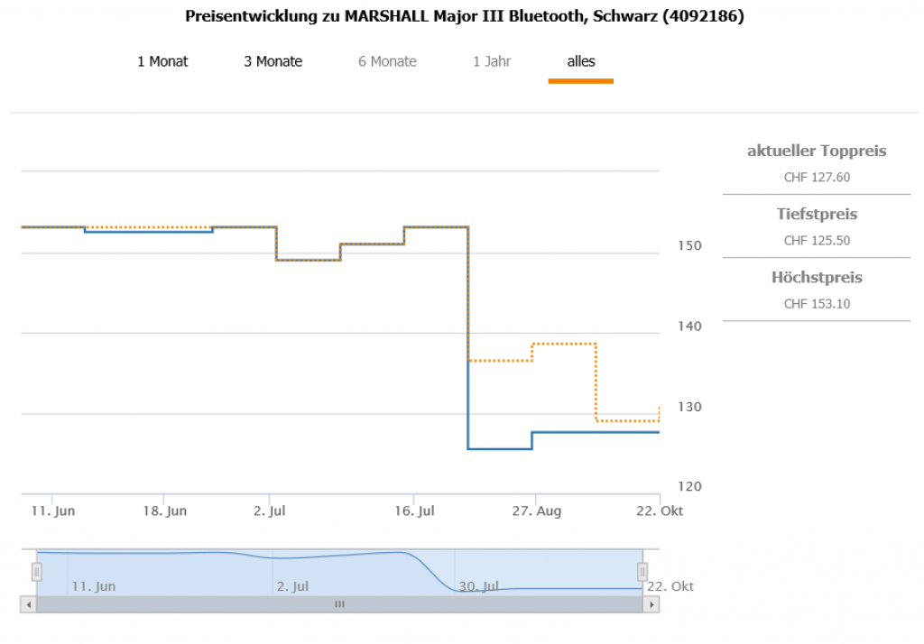 Gemäss toppreise gab es den Kopfhörer über alle Farben bislang nie günstiger als für 129.- CHF, der zweitbeste Preis liegt aktuell bei 131.- CHF.