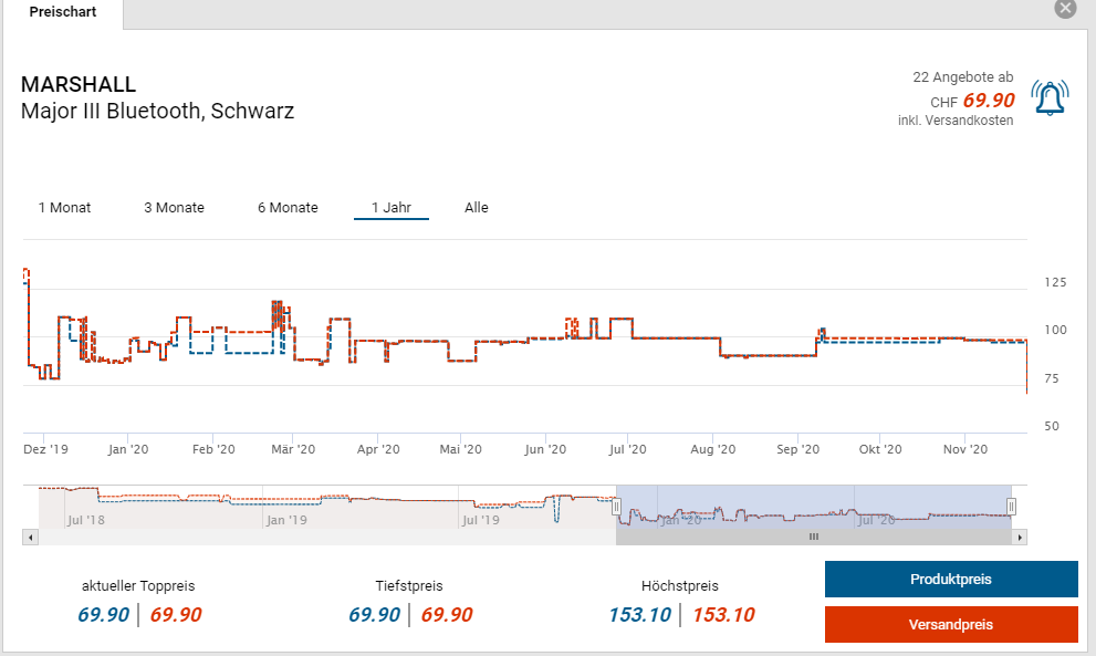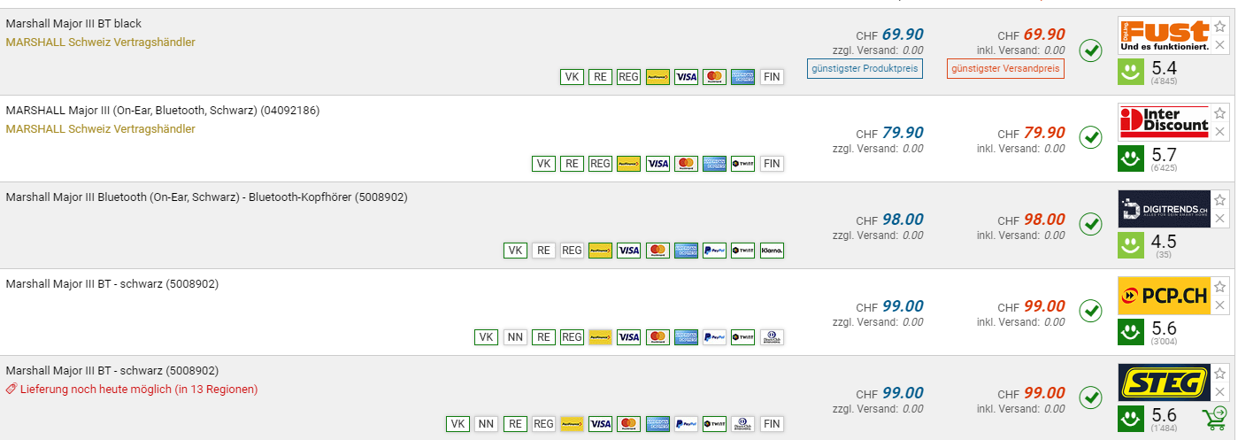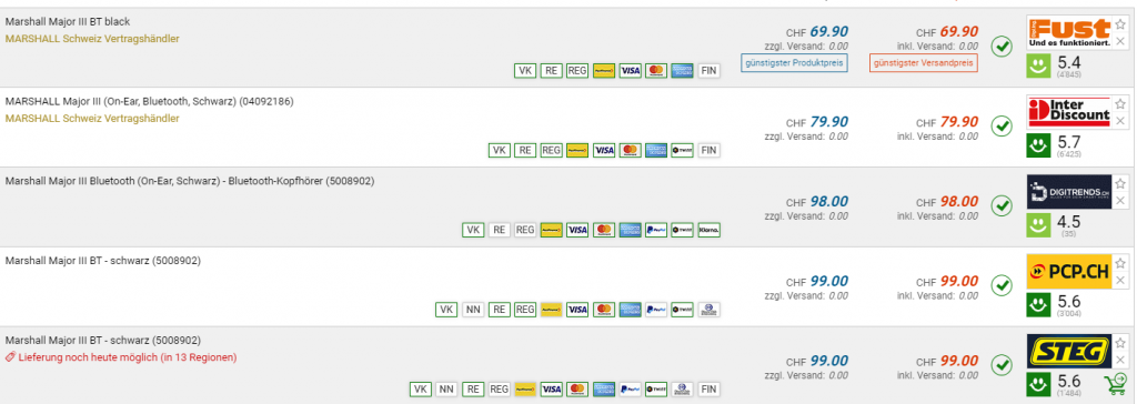 Bei Fust gibt es die MARSHALL Major III Bluetooth Kopfhörer für den Bestpreis von CHF 69.90. Vor einem Jahr gab es die Kopfhörer noch etwas günstiger bei Amazon. Der zweitbeste Preis beträgt CHF 79.90.