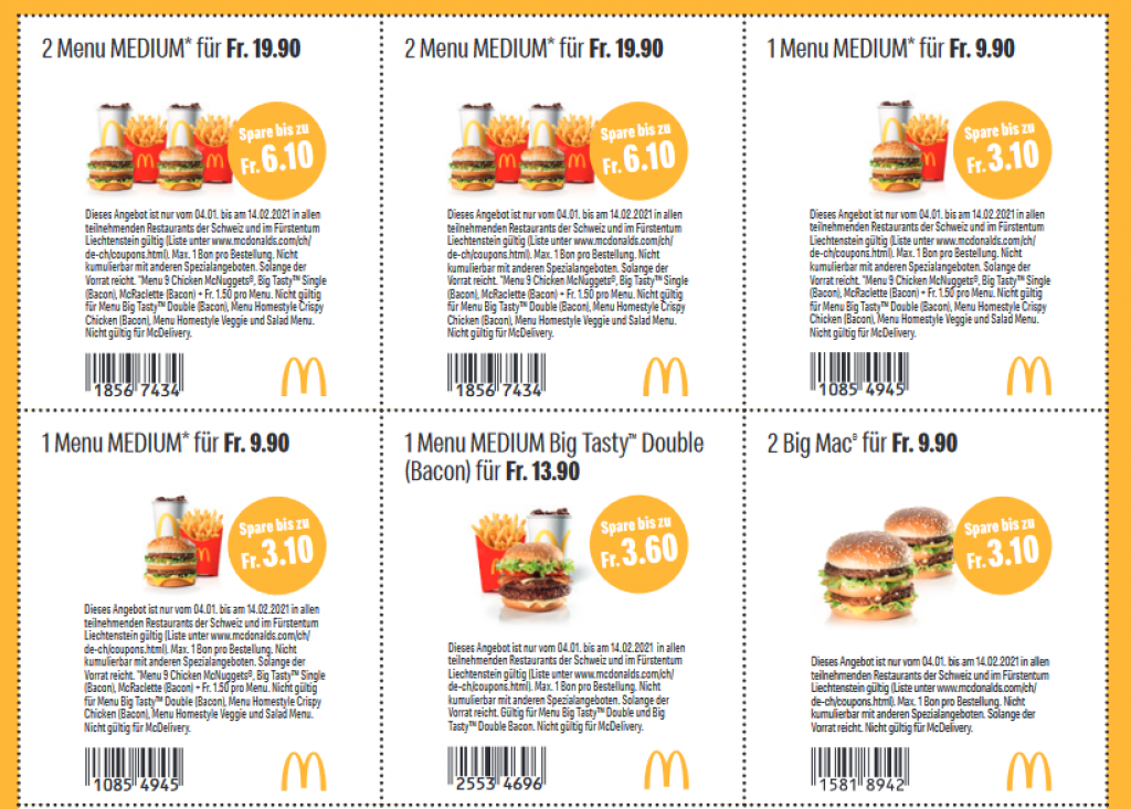 Bis zum 14.02.2021 könnt ihr bei McDonalds von diversen Aktionen profitieren. Da die App leider immer mal wieder rumzickt, findet Ihr alle Bons als PDF unter dem Deallink.