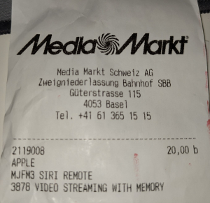 Beim Mediamarkt in Basel (evtl nur Lokal) gibt es die Apple TV Remote der 2. Generation für 20.- Vergleichspreis gibt es nicht wirklich, da es bereits eine 3. Generation gibt.