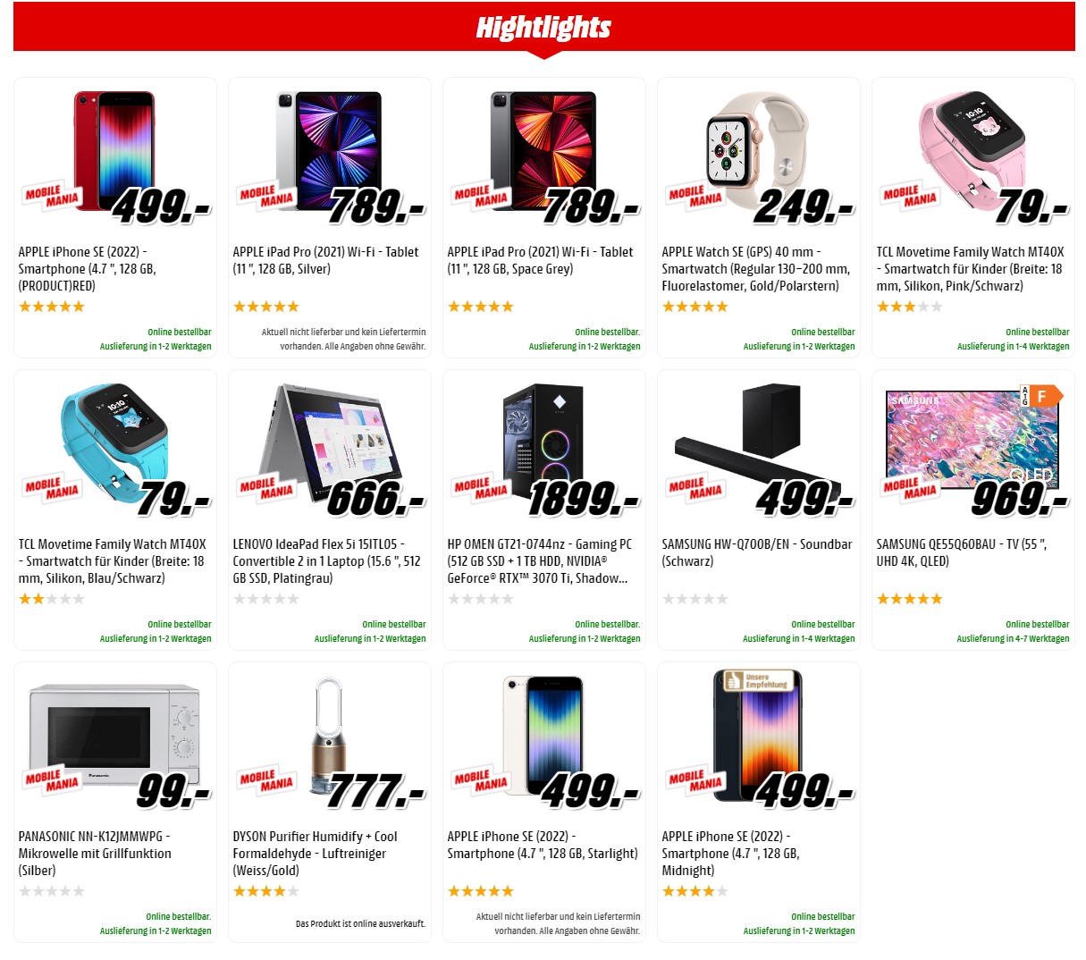 Bei MediaMarkt läuft gerade der Mobile Mania Sale mit starken Angeboten aus folgenden Kategorien: Telefonie, Computer, TV, Sound, Gaming, Haushalt, Küche, Foto & Video, Büro & Netzwerk sowie Beauty.