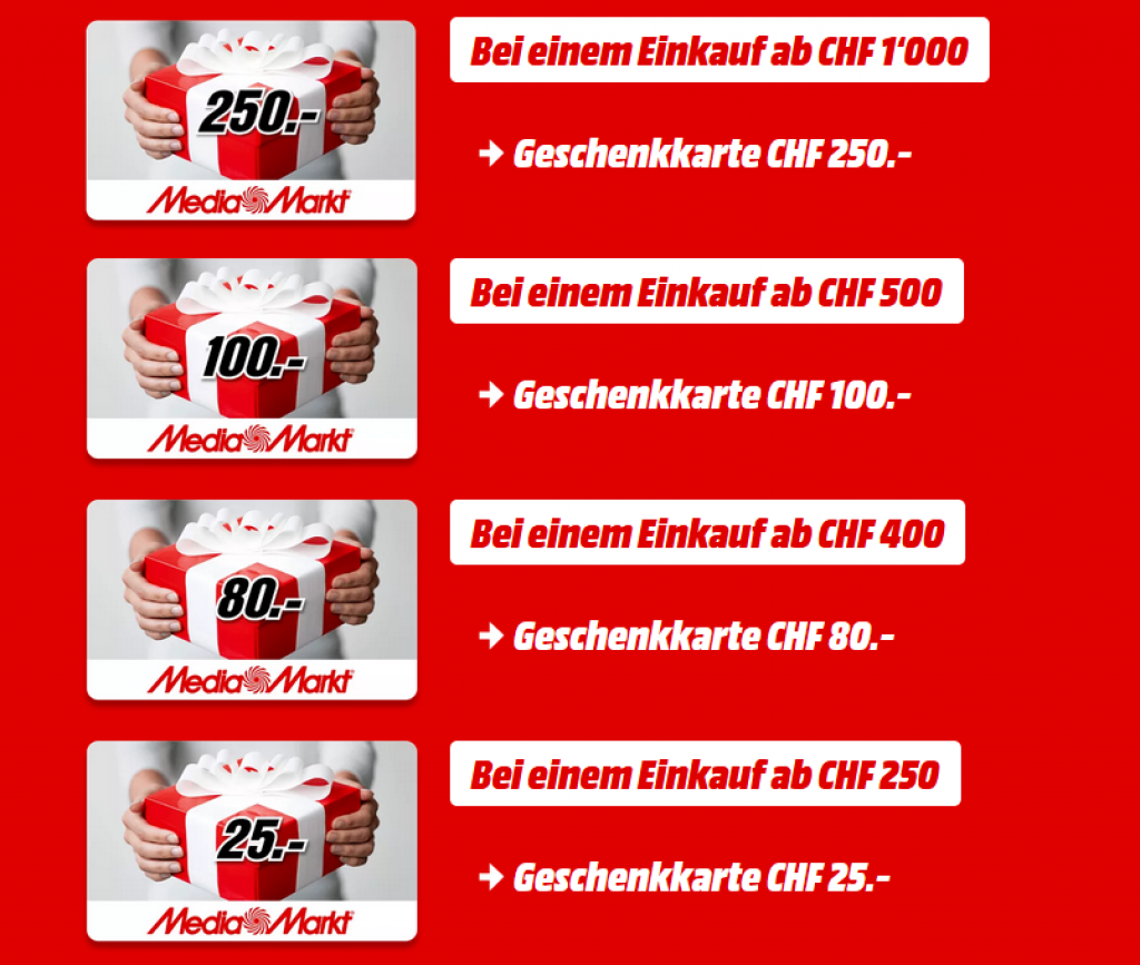 Jetzt bei Media Markt einkaufen und von einer Geschenkkarte profitieren. Staffelung wie folgt:
