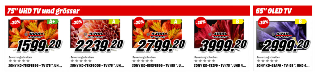 - SONY KD-75XF8596 für CHF 1’599.20 (Zweitbester Preis: 1’995, Bestpreis bisher: 1’799)