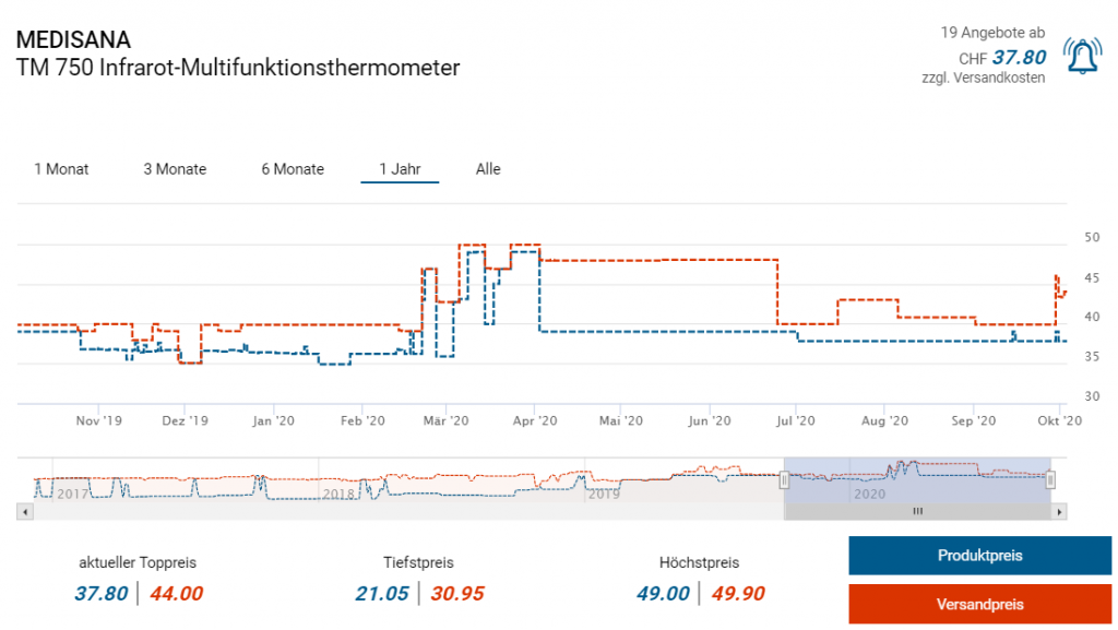 Bei nettoshop gibts derzeit den Fieberthermometer für die Stirn oder im Ohr zum Aktionspreis von CHF 39.90. Laut toppreise liegt der nächsttiefere Preis zwar bei 44 Franken, dort ist allerdings kein Liefertermin angegeben, daher rechne ich mit CHF 46.90 (2-4 Wochen Lieferzeit).