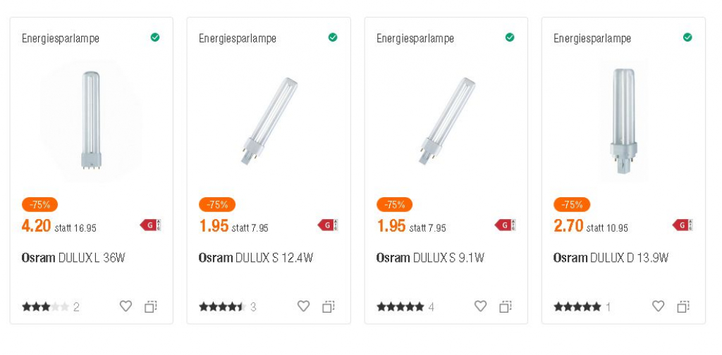 Bei melectronics gbt es zur Zeit 4 versch. Osram Dulux Sparlampen zu 75% Rabatt.