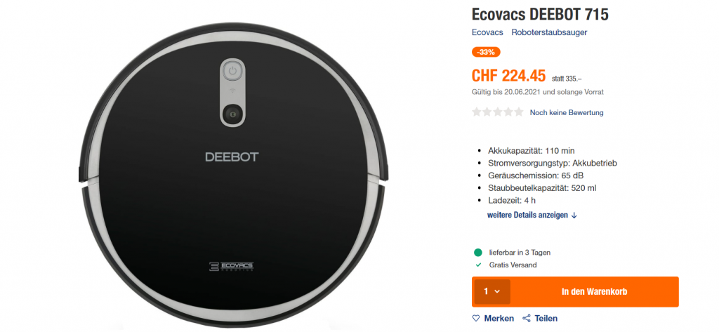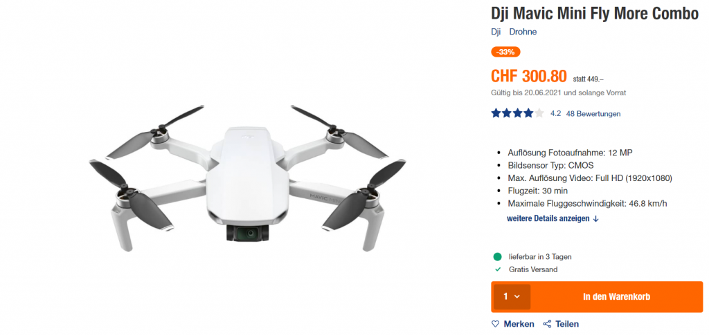 Das Mavic Mini Fly More Combo ist auch online verfügbar CHF 300.80 https://www.melectronics.ch/de/p/793834200000/dji-mavic-mini-fly-more-combo