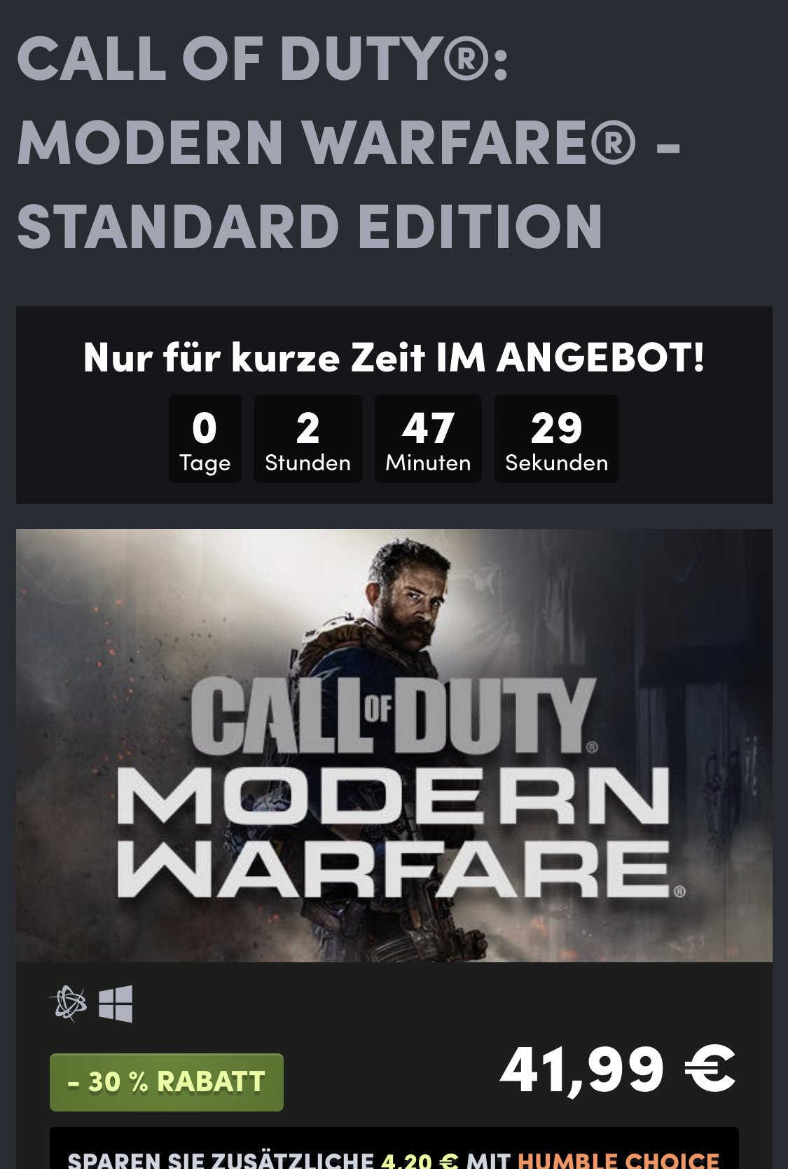 Hallo zusammen,bei humblebundle.com gibt es gerade (noch für 2 ½ Stunden) die PC-Version von CoD Modern Warfare für umgerechnet rund 45 CHF.
