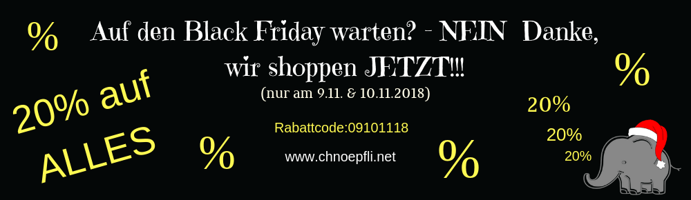 Chnöpfli zieht den Black Friday bereits vor und bietet heute auf das gesamte Sortiment ausser Gutscheinen und Beschriftungen 20 % Rabatt auf alles an.