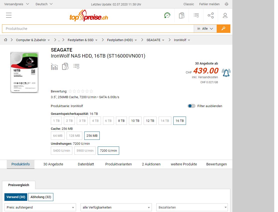 Bei Digitec/Galaxus erhält man eine 16TB IronWolf HDD 16TB zum absoluten Bestpreis, laut Toppreise.ch lag der Tiefstpreis bei CHF 479.00 im September 2019.