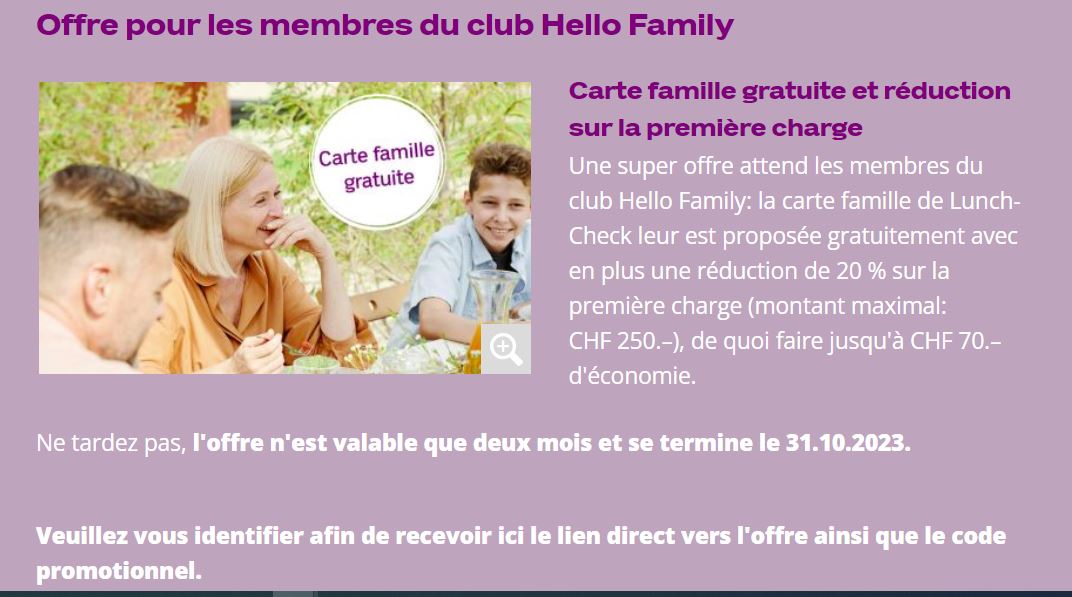 Les membres du “Hello Family Club” de Coop ont la possibilité de recevoir gratuitement une carte Lunch-Check personnalisée jusqu’au 31.10.2023. Ils bénéficient en outre d’une remise de 20% sur la première rech […]