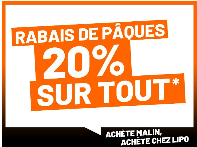 Chez LIPO, il y actuellement actuellement un rabais de 20% sur presque tout ! Vous trouverez ici quelques exemples de bons plans qui pourraient vous intéresser :