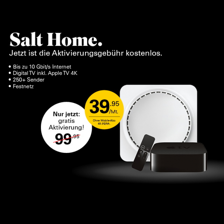 Chez Handy Abovergleich, vous pouvez actuellement vous procurer l’abonnement Internet Salt Fiber avec 200 francs de cashback et l’Apple TV 4K gratuite.