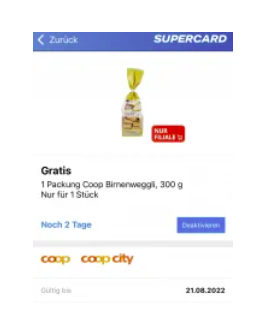 Dans l’application Supercard, il y a un bon pour un paquet gratuit de petits pains aux poires Coop, 300 g. Ce bon n’est valable que pour une seule pièce.
