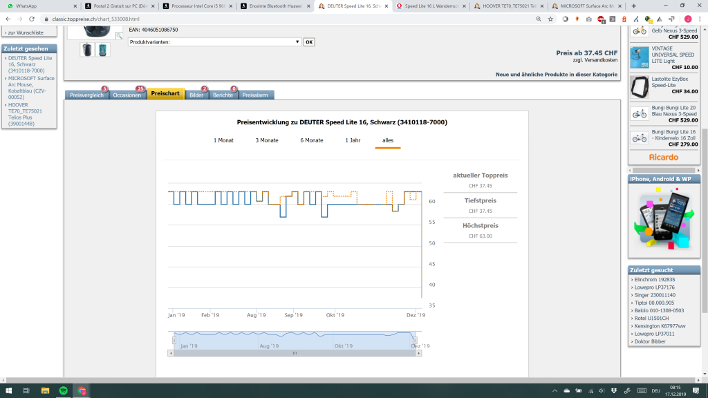 Ochsner Sport propose actuellement le sac à dos de randonnée Deuter Speed Lite 16 L au prix de 37.45 CHF. Le second meilleur prix est de 63 CHF, le meilleur prix était de 58 CHF.