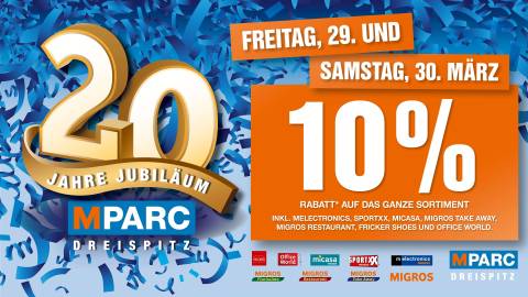 Migros Dreispitz célèbre ses 20 ans avec une réduction de 10% sur une large variété de produits le vendredi 30.03.2019 et le samedi 30.03.2019.