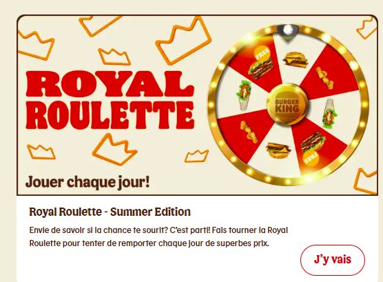 Dans l’app BK (Burger King), il est possible de tourner la roulette royale 1 par jour et, avec un peu de chance, de remporter un Whopper ou d’autres prix.