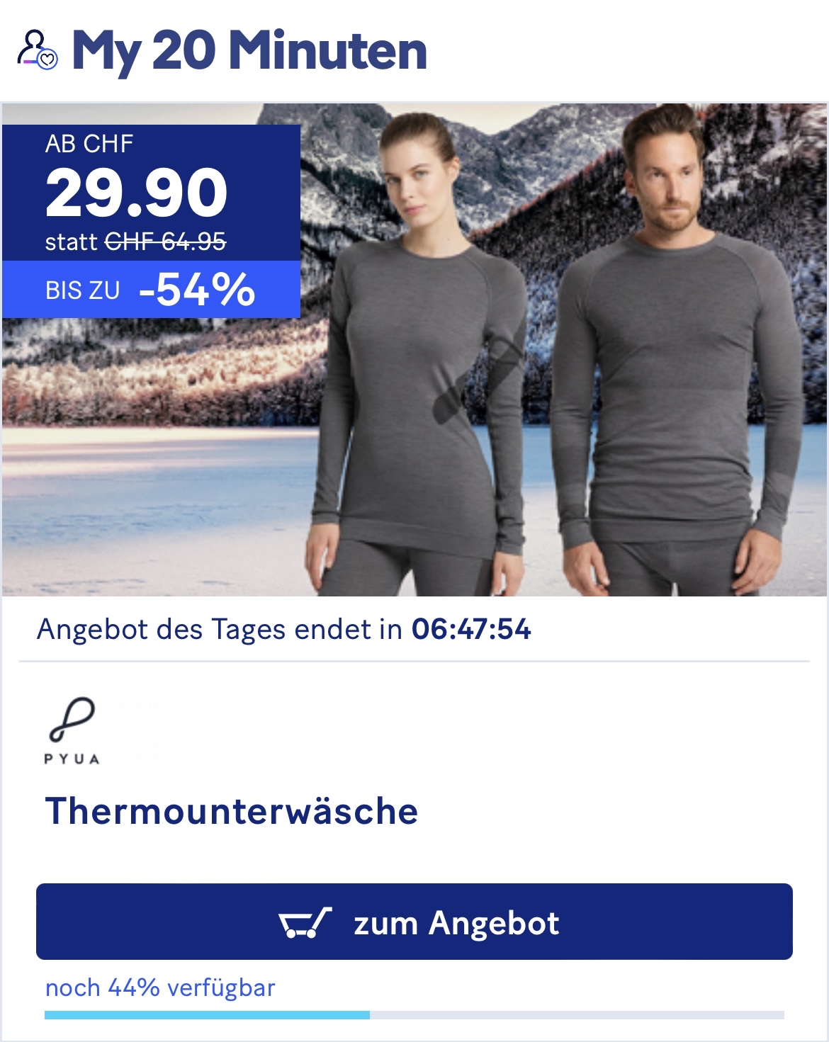 Bei den 20 Minuten Deals gibt es heute Thermo Bekleidung, die 50% und mehr reduziert sind.