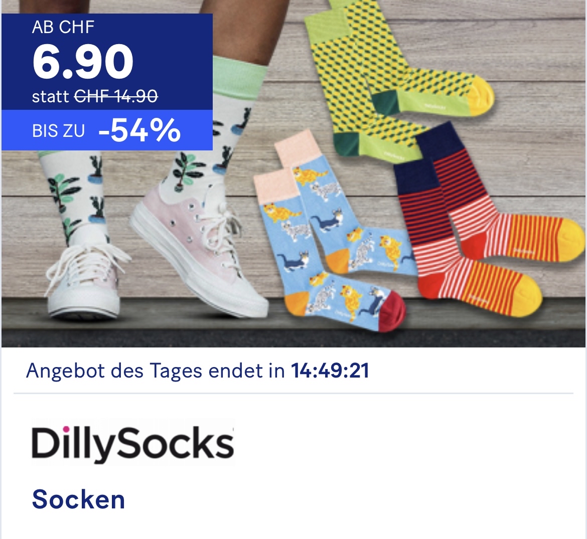 In den 20 Minuten Deals gibt es heute DillySocks im Angebot. Das sind bunte, lustige, farbige Socken – für Mann, Frau und Kind.