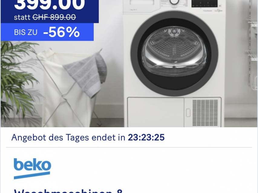 Bei den 20 Minuten Deals gibt es heute die Beko 50081466CH1 Waschmaschine zum Toppreis. Zweitbester Preis ist 799.-