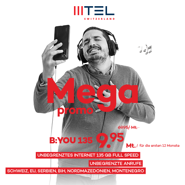 Aktuell gibt’s bei MTEL das Abo B:YOU 135 für nur CHF 9.95/Monat während der ersten 12 Monate. Danach kostet das Abo CHF 69.95/Monat.