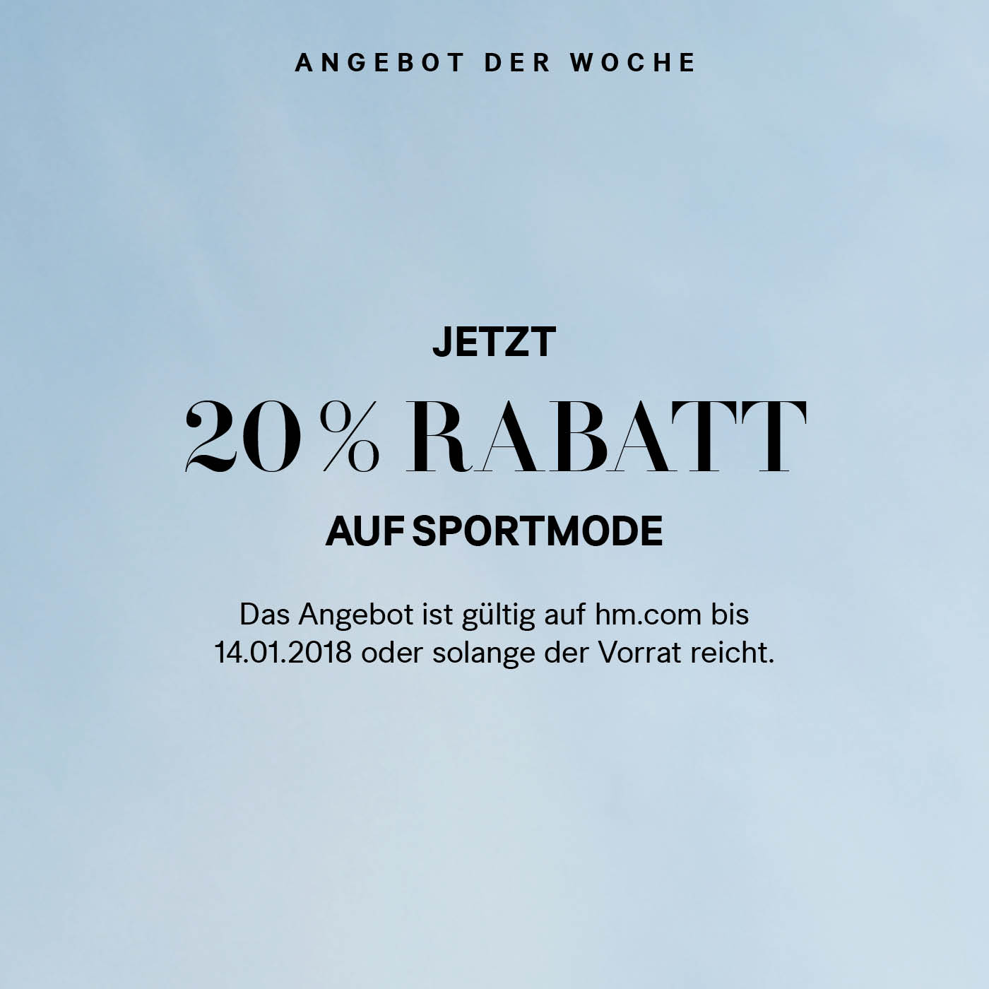 Bei H&M gibts auf Sport und Fitness Mode 20 Prozent Rabatt. Das Angebot ist nur online gültig. Bis und mit dem 14.1.2018 kann man von dem Angebot profitieren.