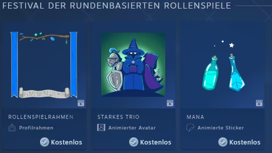 Bei Steam gibt es mal wieder animierte Avatare, Profilrahmen und animierte Sticker, aktuell im Rahmen des Festivals der rundenbasierten Rollenspiele. Bis wann dies gültig ist, ist leider nicht bekannt.