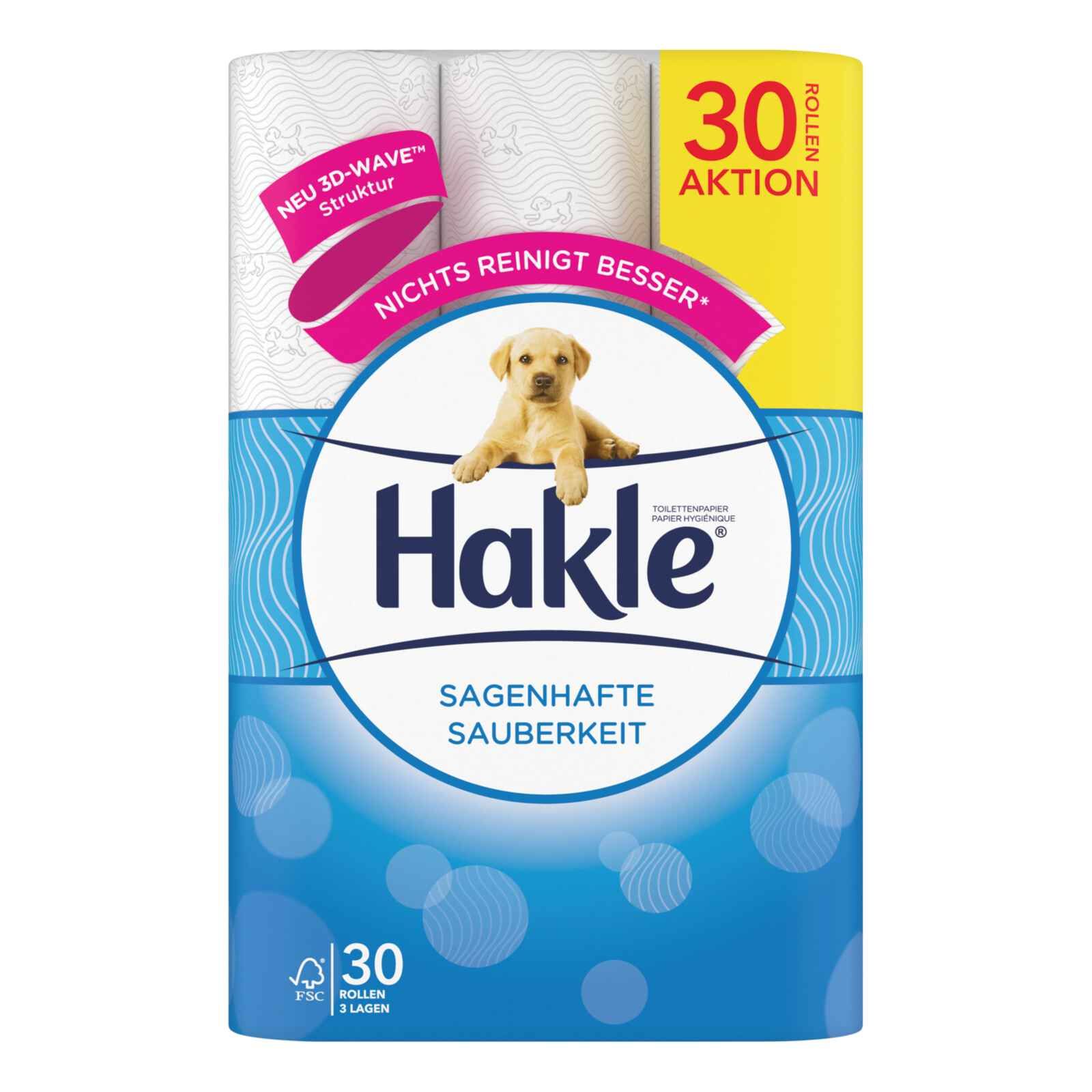 Hakle Toilettenpapier Sagenhafte Sauberkeit blau / weiss, 3-lagig, 30 x 150 Blatt, CHF 13.95.-