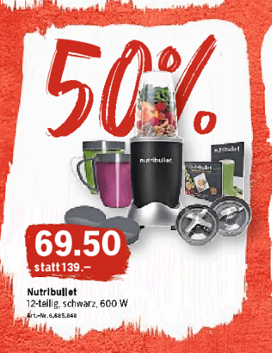 Bei Coop Bau + Hobby gibt’s den Nutribullet, 12-teilig, 600W, im Sale zum halben Preis; anstatt CHF 139.- kostet er nur noch CHF 69.50.