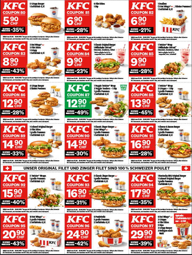 Es gibt wieder mal neue KFC Gutscheine gültig bis und mit 18. August, nachdem die letzten Ende März abgelaufen sind. Eine gute Möglichkeit günstig im KFC zu profitieren und geniessen 🙂