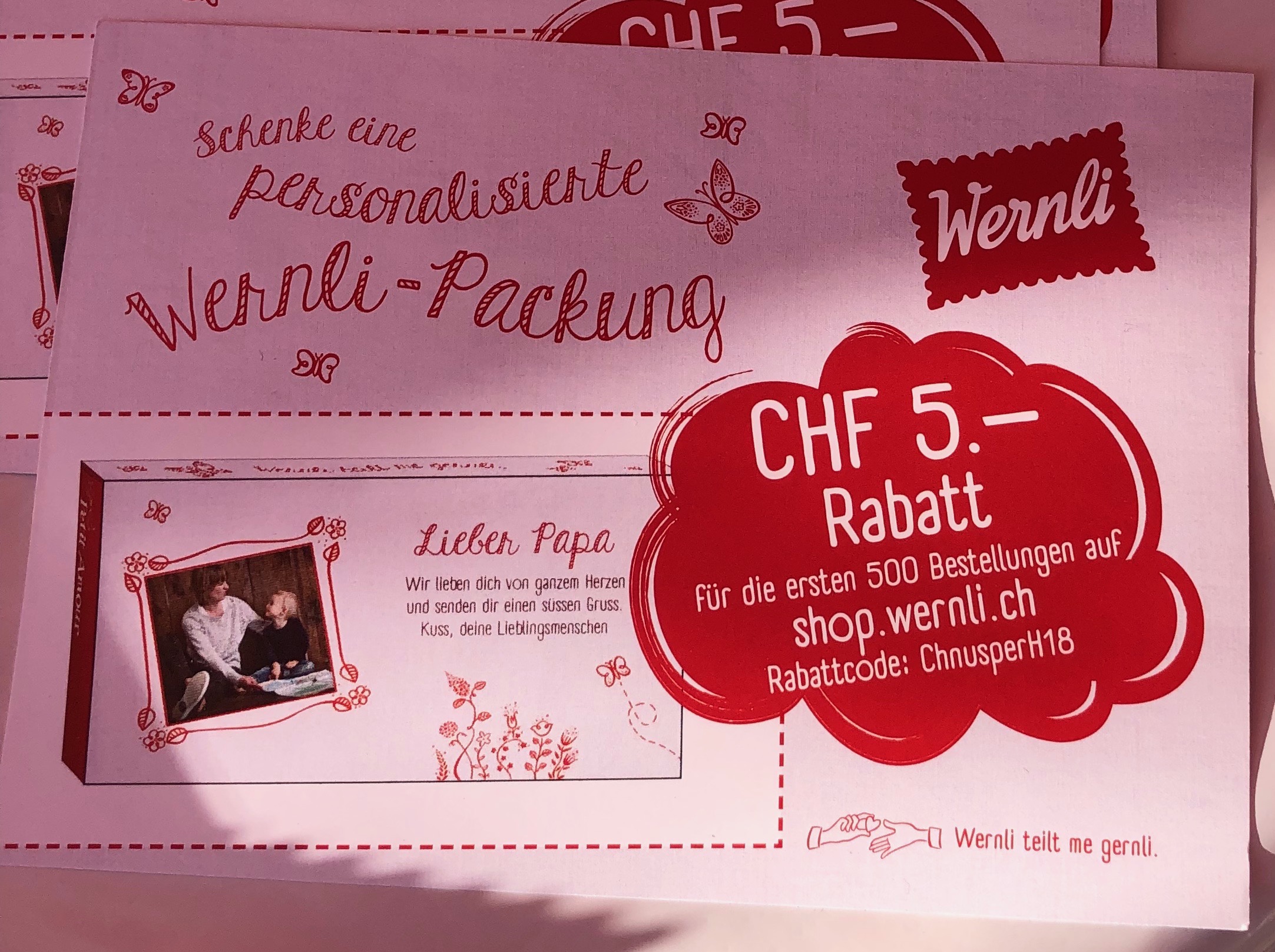 Bei Wernli bekommen zur Zeit die ersten 500 Bestellungen einen 5.- Rabatt auf eine individuell gestaltete Guetzlipackung.