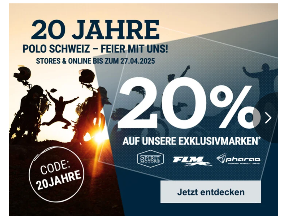 Polo Schweiz hat eine Jubiläums Aktion, 20% auf alle exklusiv Marken wie FLM uvm.