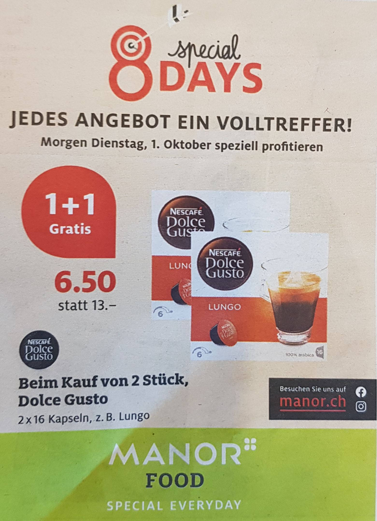 Paqo-PZ hat den neuen Beitrag Manor: Dolce Gusto Kapseln 50% günstiger…..Fr. 6.50 statt 13.- (nur offline gültig) geschrieben vor 6 Jahren, 2 Monaten