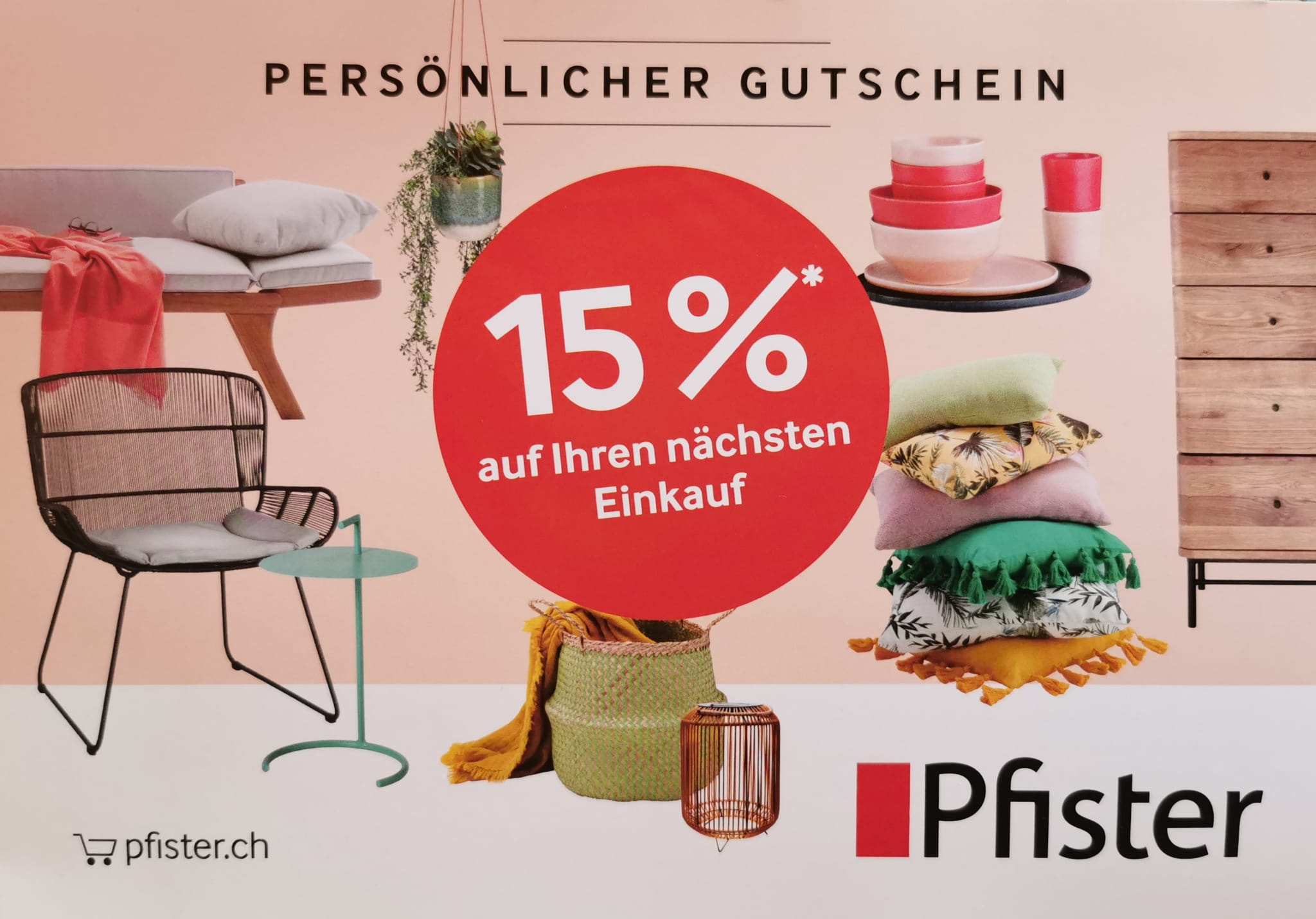 15 % Rabatt Gutschein auf den nächsten Einkauf in jeder Pfister Filialie einlösbar. Auch bei online bei pfister.ch gültig.