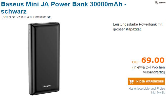 Aktuell kann man die Baseus Mini JA Power Bank 30’000 mAh mit dem Gutscheincode aus dem pc-ostschweiz.ch Newsletter für CHF 49.- anstelle von CHF 69.- haben.