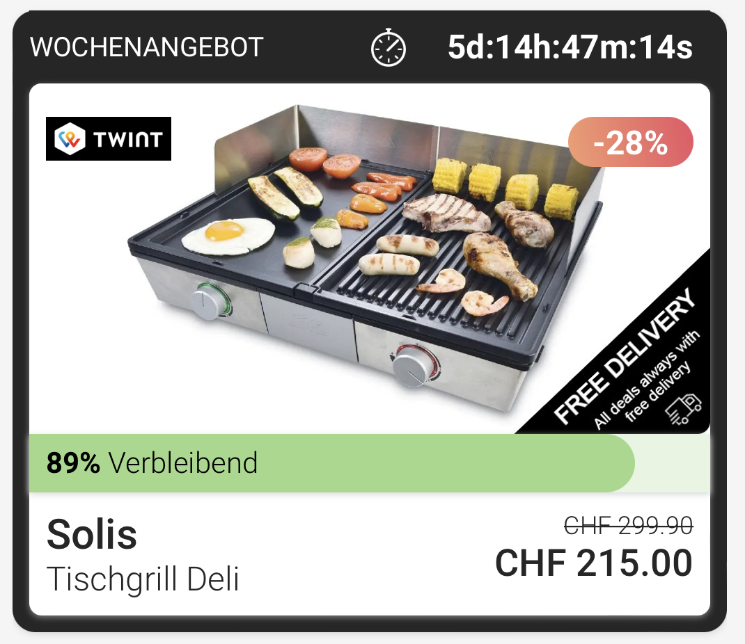 In der Twint App wird der Solis Tischgrill Deli (7957) für CHF 215.- angeboten.