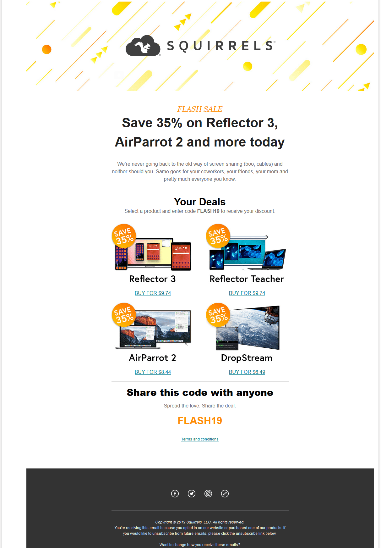 Bei Squirrels Software gibt’s gerade einen Flash Sale mit 35% Rabatt auf Reflector 3, AirParrot 2 und weitere Software. Nur heute gültig.
