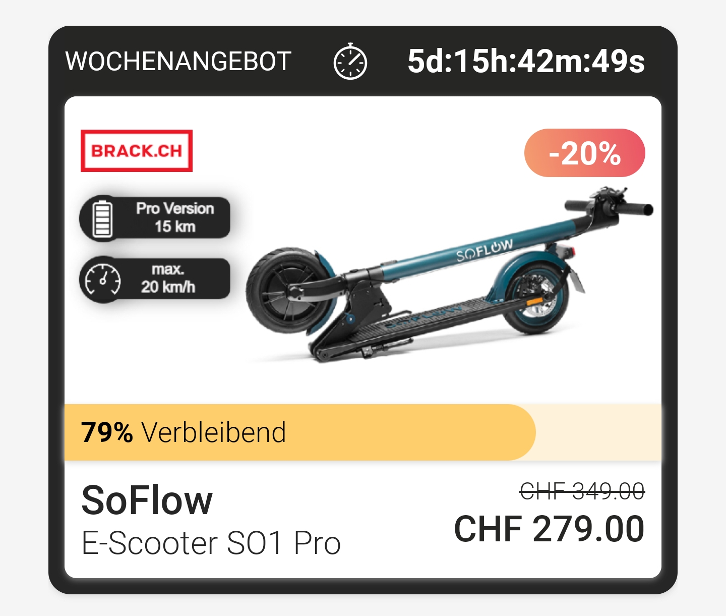 Diese Woche gibts bei TWINT den E-Scooter SoFlow SO1 Pro für 279.- statt 349.- CHF. Preis/Leistung meines Erachtens sehr gut. Achtung, beim Preisvergleich nicht mit dem Light Modell verwechseln.