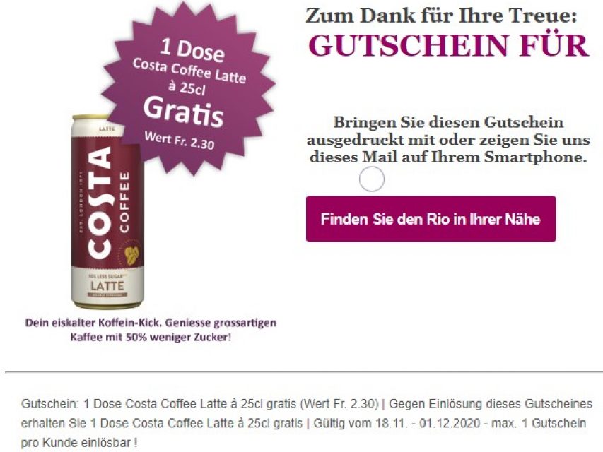 Im Rio Getränkemarkt gibt es für Newsletter-Abonnenten als Treuegeschenk eine 25 cl Dose „Costa Coffee Latte“ im Wert von CHF 2.30.