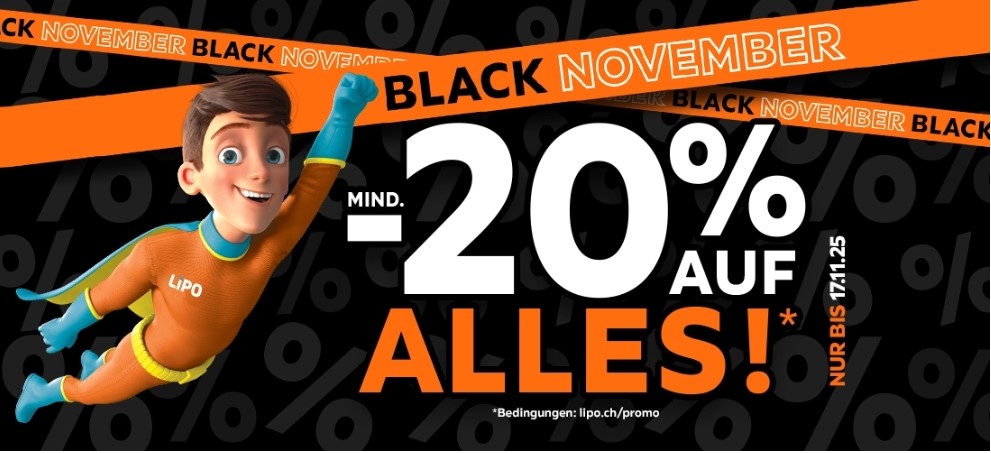 Jetzt durchstarten: Im Rahmen der BLACK NOVEMBER‑Aktion bei LIPO bekommst du mindestens 20 % Rabatt auf das gesamte Sortiment – gültig nur bis zum 17. November 2025.