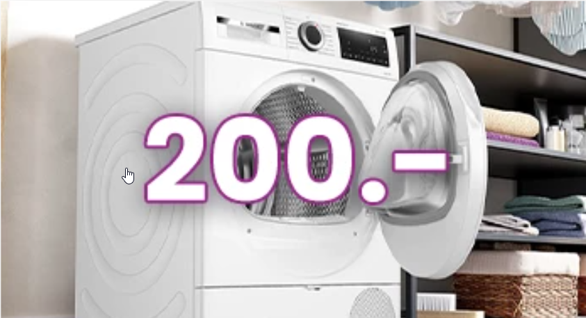 Jetzt sparen bei Conforama! Auf eine große Auswahl an Waschmaschinen und Trocknern erhalten Sie bis zu CHF 200 Cashback! Perfekt für die Aufwertung Ihrer Haushaltsgeräte mit zusätzlichen Ersparnissen.