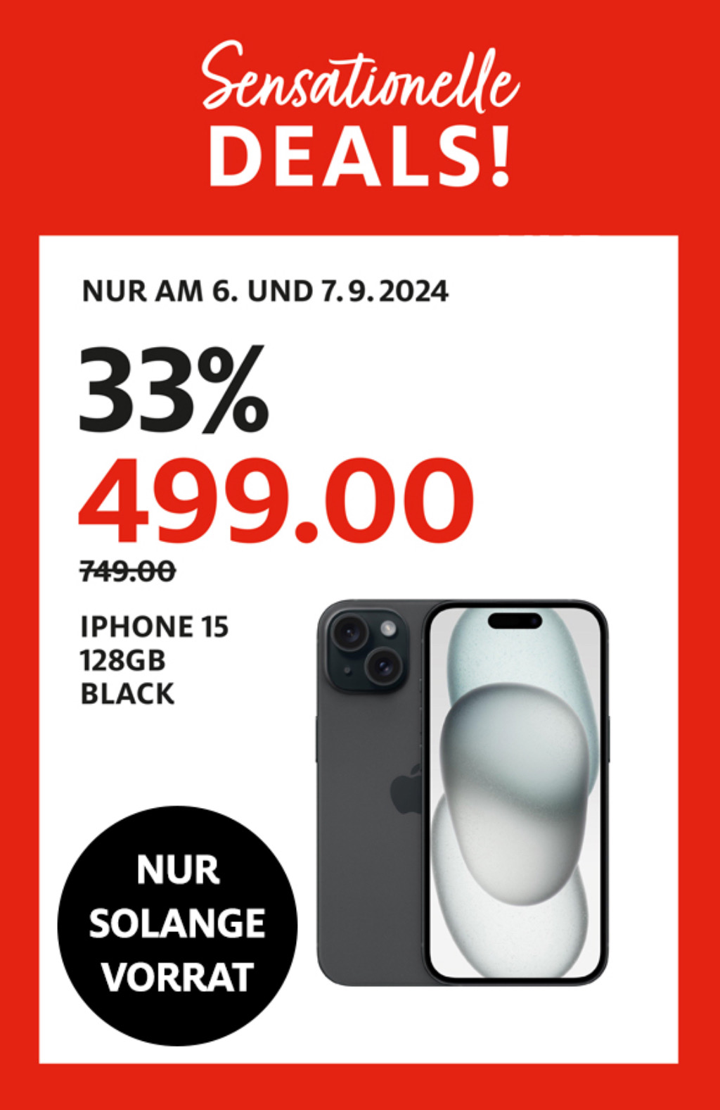 Das Angebot ist limitiert auf 1 iPhone pro Person. Nur solange der Vorrat reicht. Nur in den folgenden Warenhäusern erhältlich.