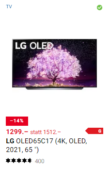 Momentan gibt es den LG OLED65C1 bei Melectronics für 1’027.- dank einer 16x Cumulus Aktion bis zum 18.4. Finde die Aktion ziemlich schweinisch!