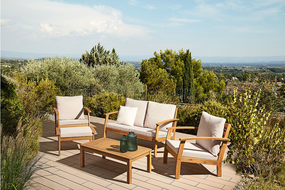 Bei Coop Bau und Hobby findet ihr die Holzlounge Set Lapua mit 1x Sofa, 2x Sessel & 1x Tisch für CHF 359.- bei Abholung. Für die Lieferung müsst ihr ansonsten CHF 65.- Speditionskosten zahlen.