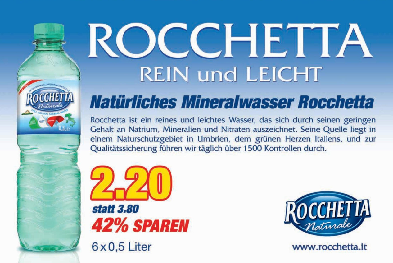In Denner findet ihr die 6×0.5l Packung Rocchetta für CHF 2.20 statt CHF 3.80.